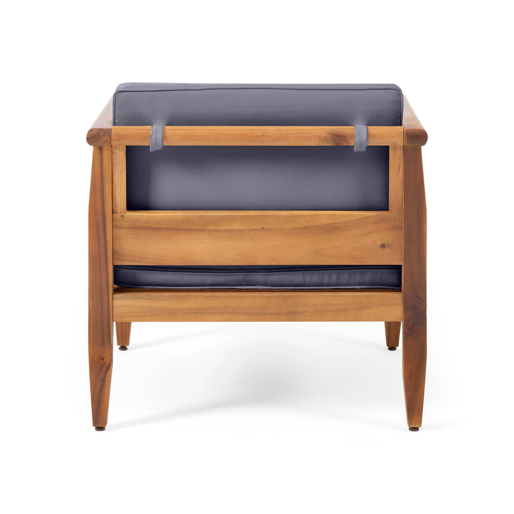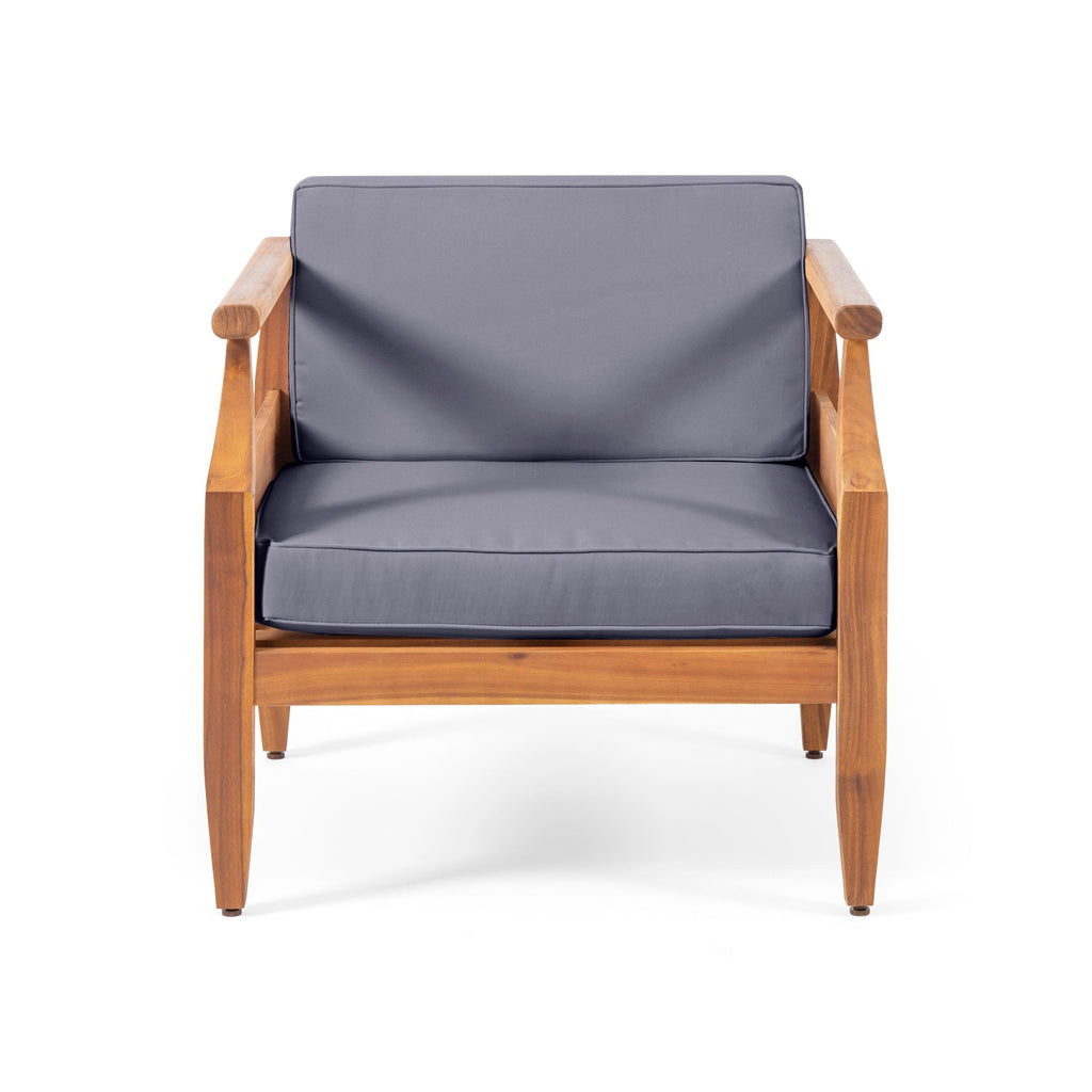 - Welcome to our lovely club chair that adds sophistication and style to your backyard or patio. The sleek design features recessed arms and open-slat seating for an inviting look. Relax and enjoy the outdoor breeze and warm sunshine with this durable, acacia wood frame chair with water-resistant cushions. Whether you're sitting with friends or just taking in the scenery, you will find yourself comfortable and content in our club chair.