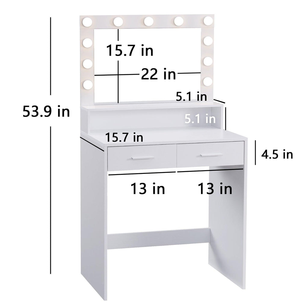 - Large Storage Drawers: Two spacious drawers offer ample storage and display space, bidding farewell to clutter and welcoming a more organized and clear space! The perfect dimensions for the vanity mirror and lit table set are 27.5' (length) * 15.7' (width) * 53.9' (height). The expansive tabletop is sleek and elegant, complemented by deep and large drawers for easy storage and arrangement of various items, keeping everything tidy.