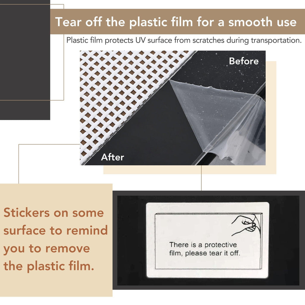 | Notice | The plastic film for protecting UV from scratches should be teared off before put into use. If there is light dust on the edge, it can be wiped with a wet rag. |