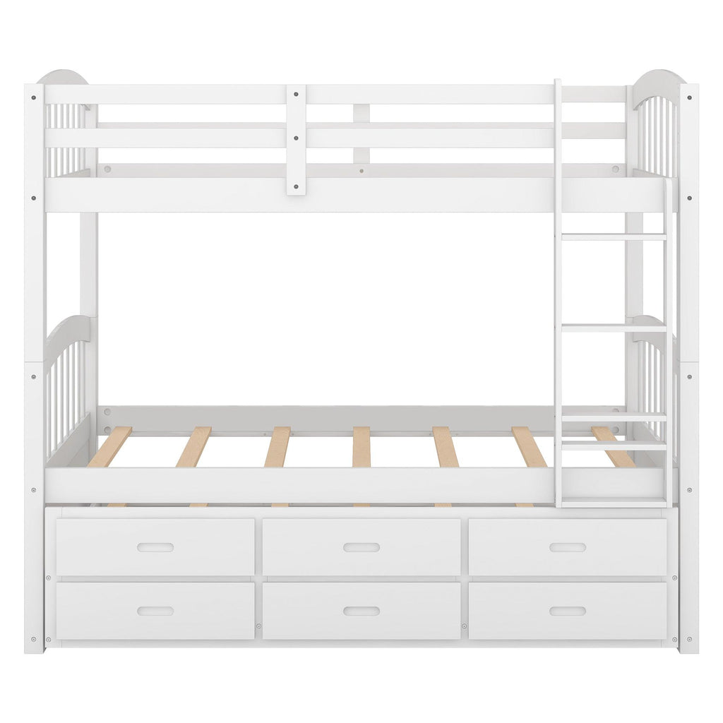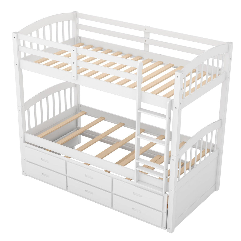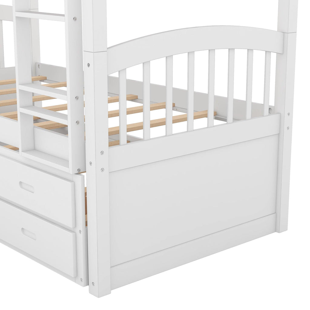 Twin over Twin Wood Bunk Bed with Trundle and Drawers,White