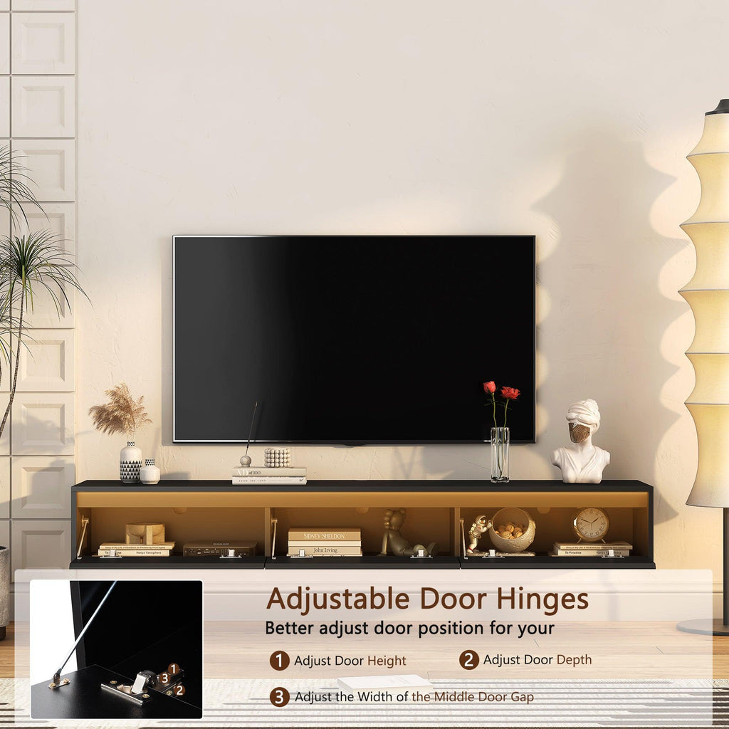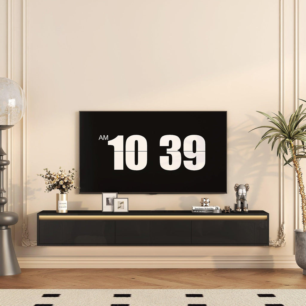 - Equipped with 3 standard plugs and 2 USB ports, the floating TV stand provides convenient power charging for your TV, DVD, WiFi router and more