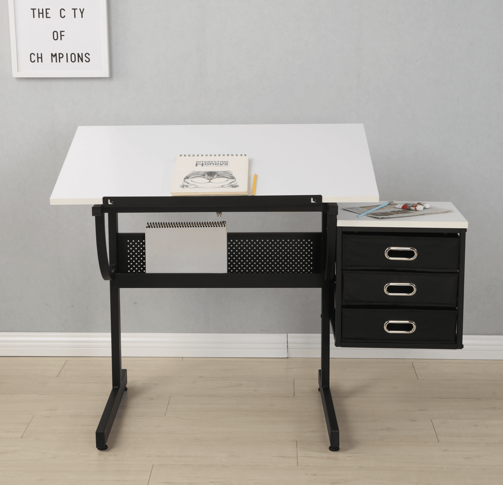 - (Sturdy Construction) The surface of the drafting table is made of 18mm E1 particle board. and is supported by a powder-coated steel frame. Has an elegant feel. Equipped with 3 non-woven drawers and a stool for storing relevant tools. Especially suitable for drawing, crafting and painting.