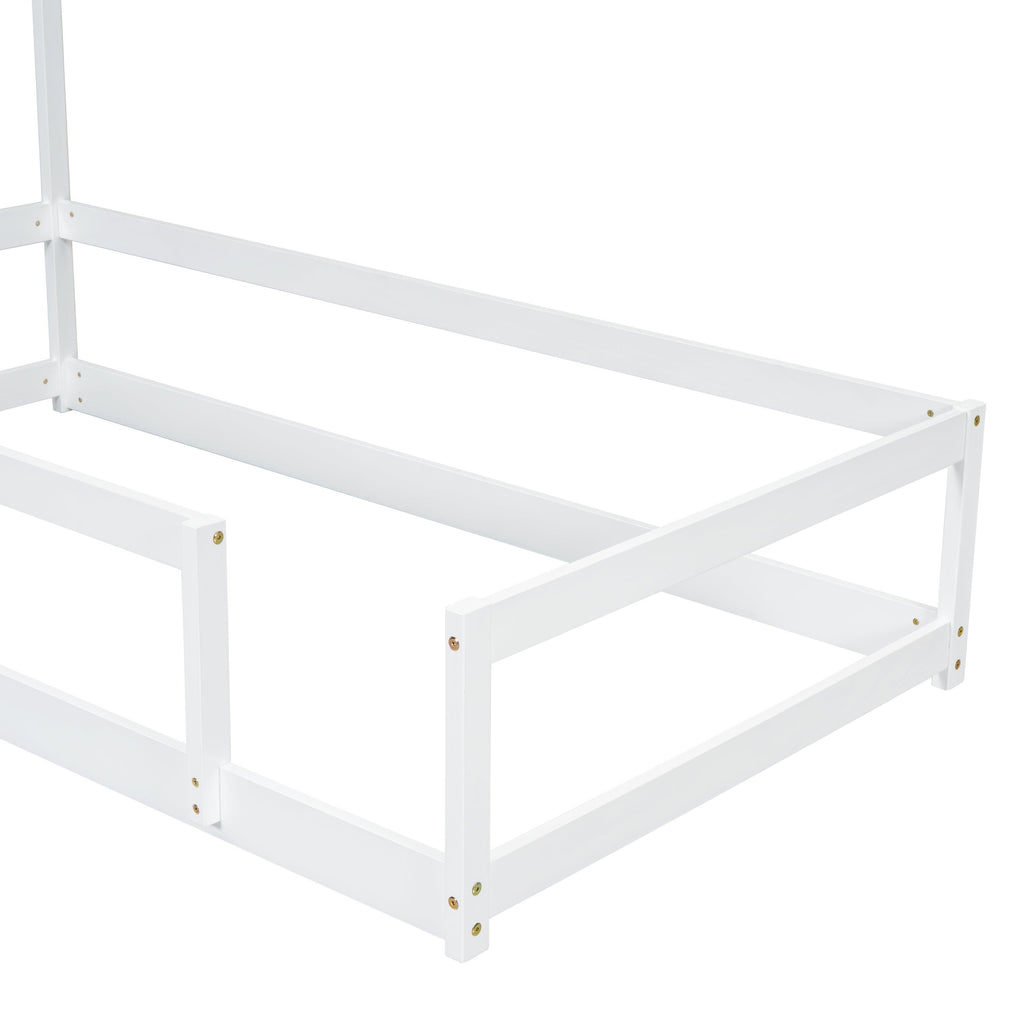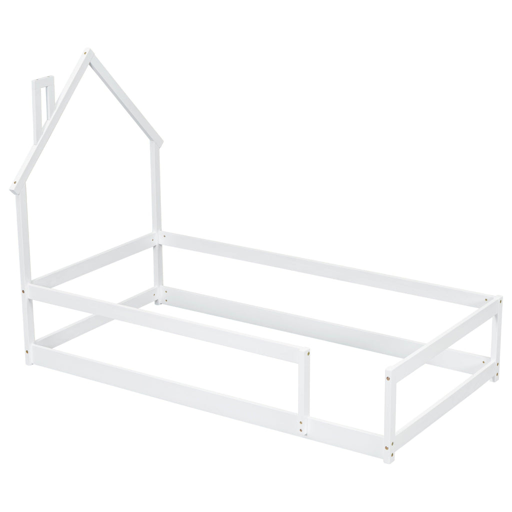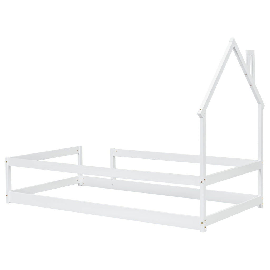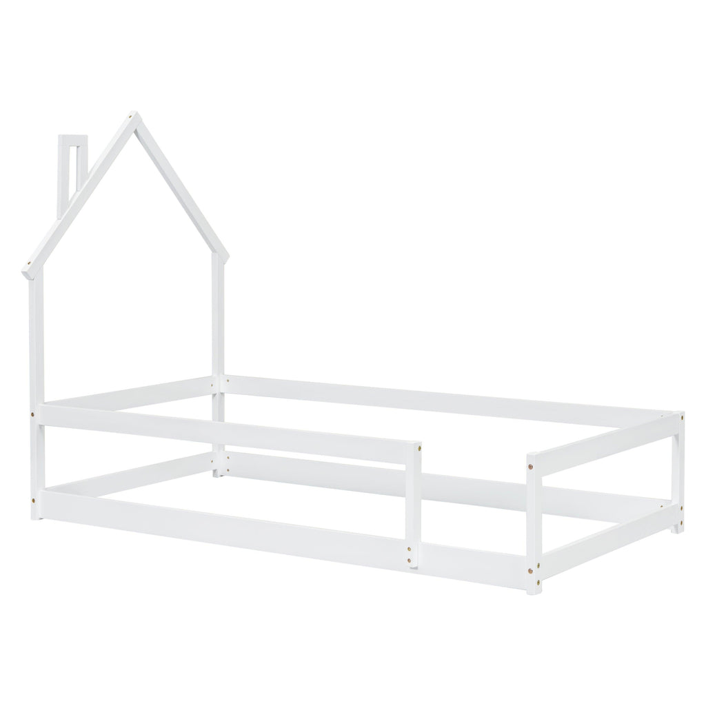 Twin Size Wood bed with House-shaped Headboard Floor bed with Fences,White