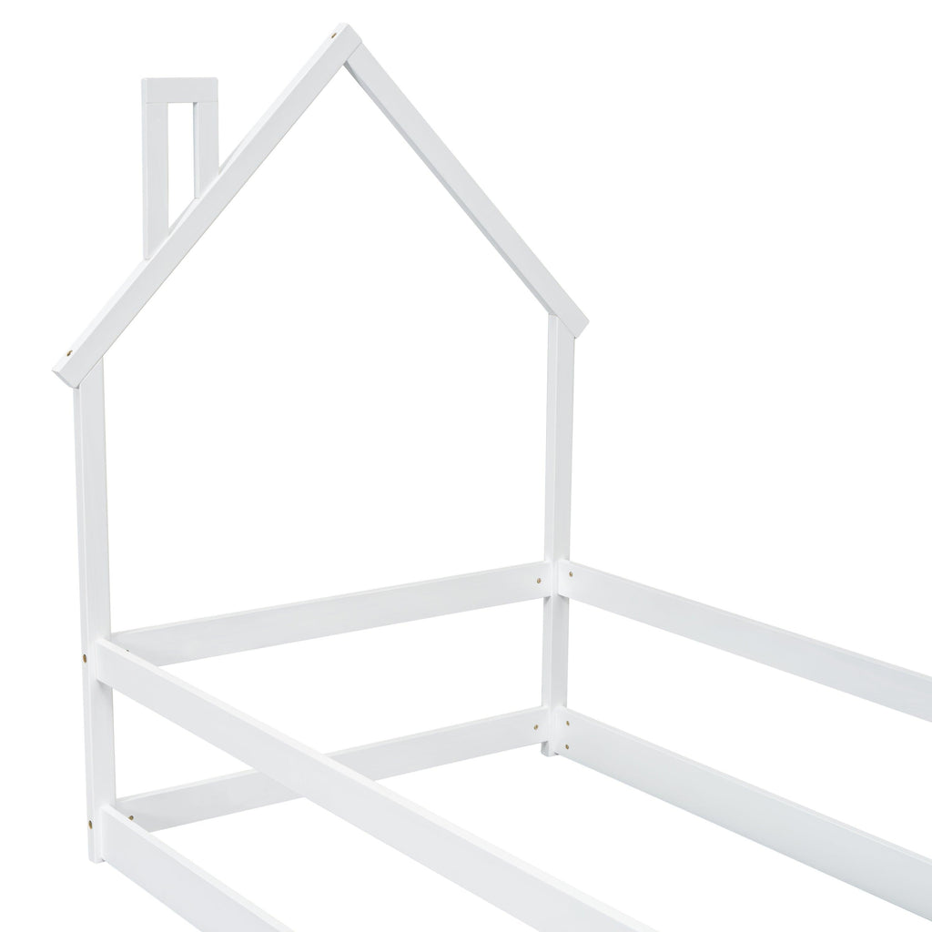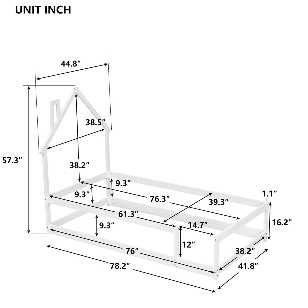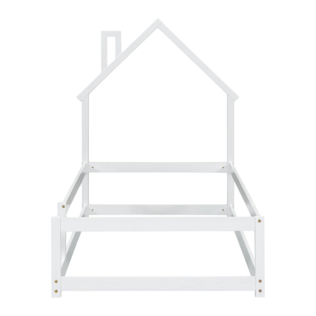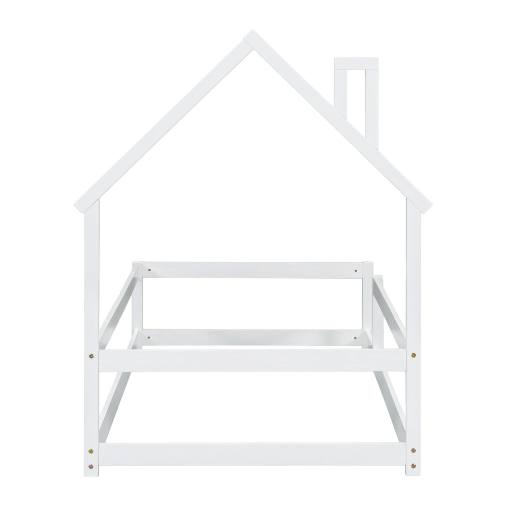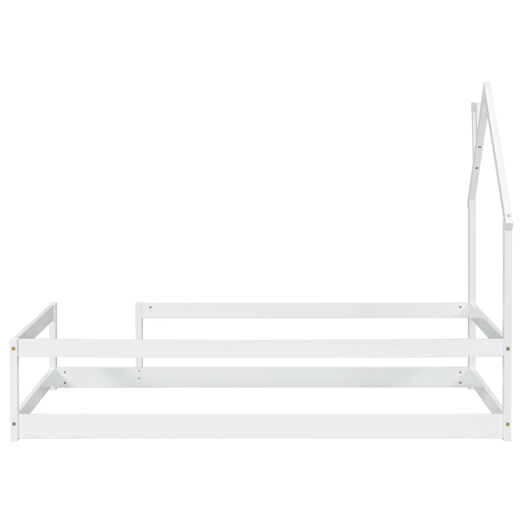 Twin Size Wood bed with House-shaped Headboard Floor bed with Fences,White