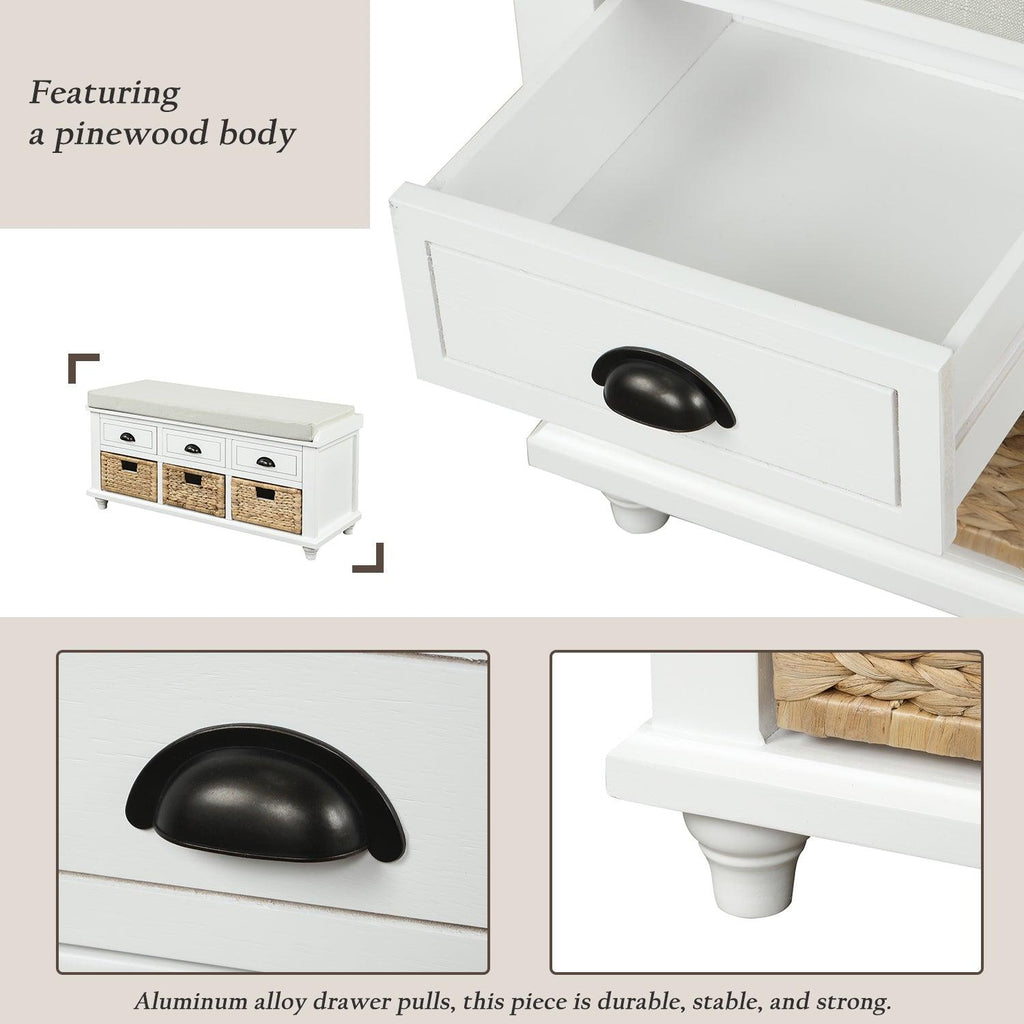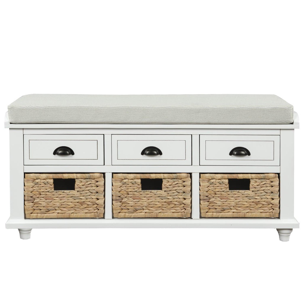 - This chic bench matches fashion with the function; it features 3 drawers and 3 removable wicker baskets. This bench adds versatile appeal to any space.
