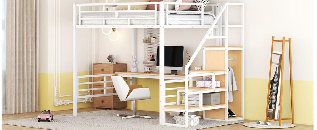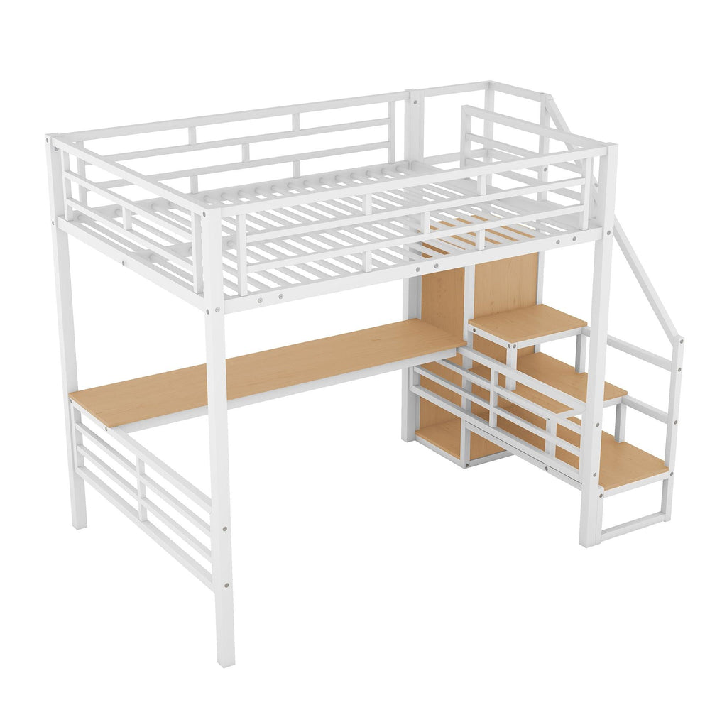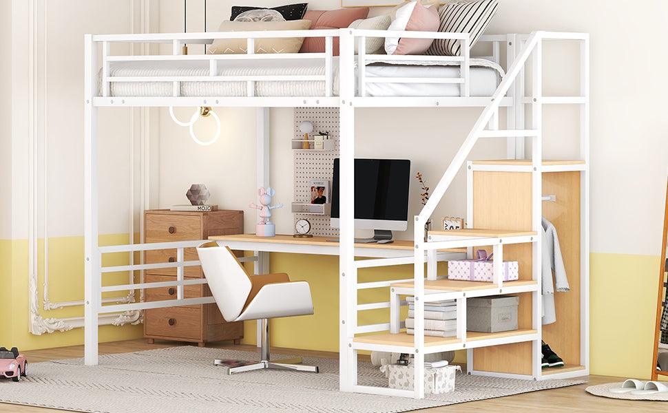 Full Size Metal Loft Bed with Desk, Storage Staircase and Small Wardrobe, Storage stairs can be inst