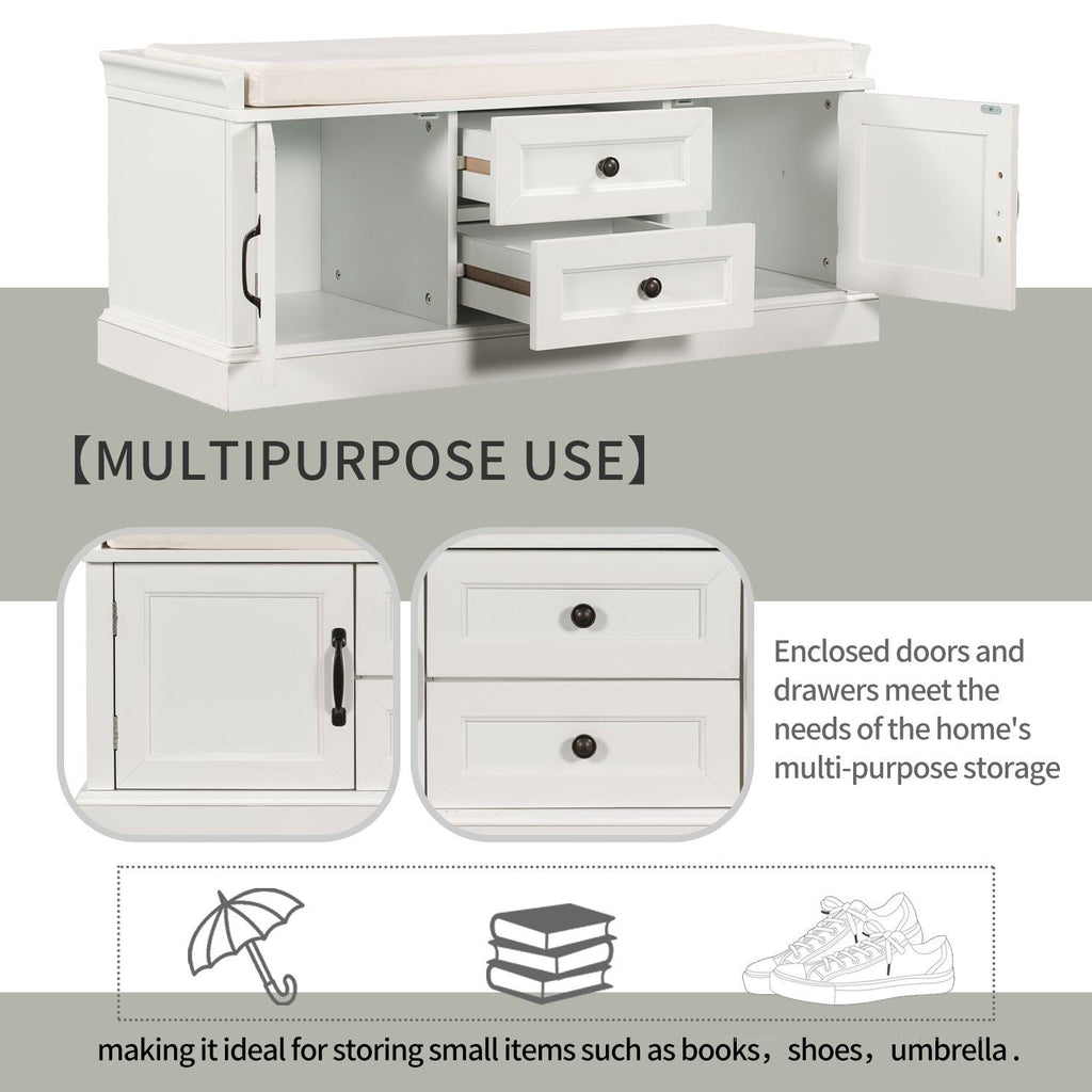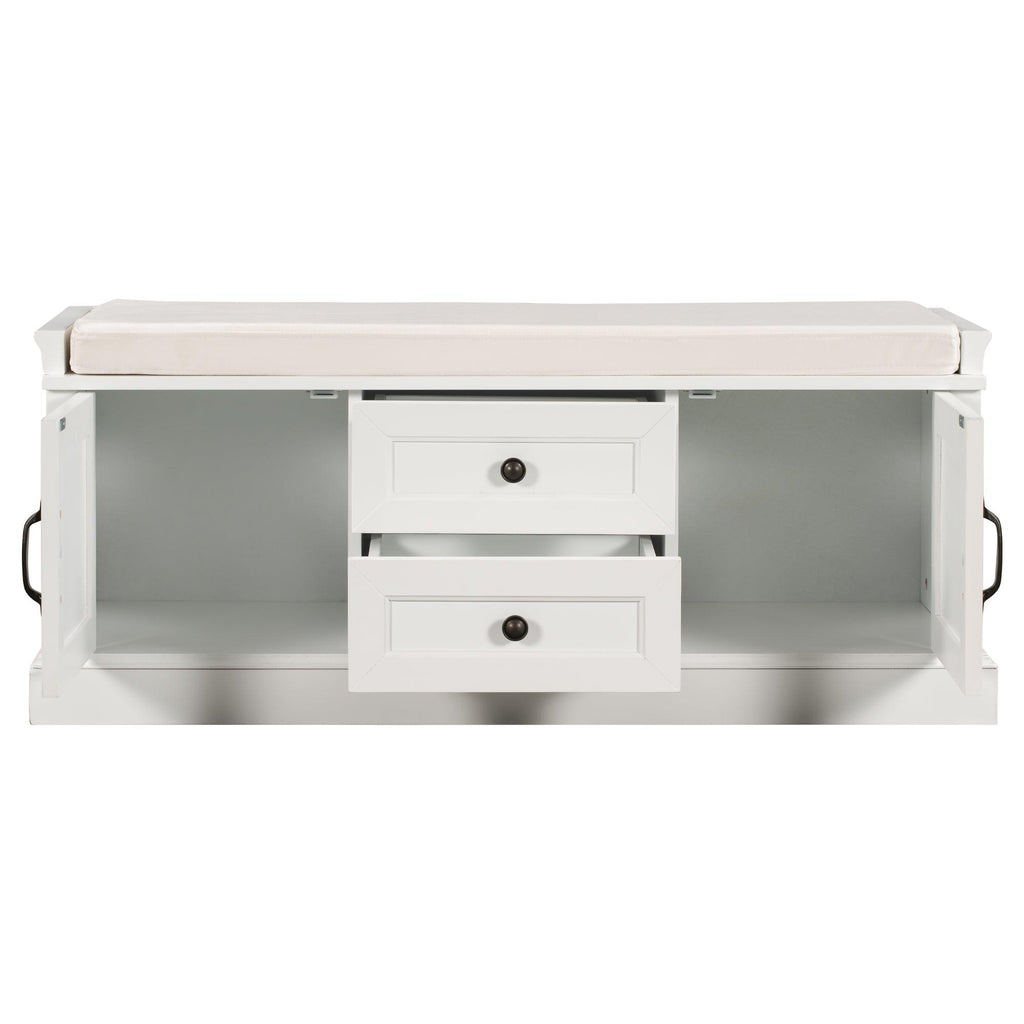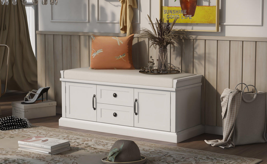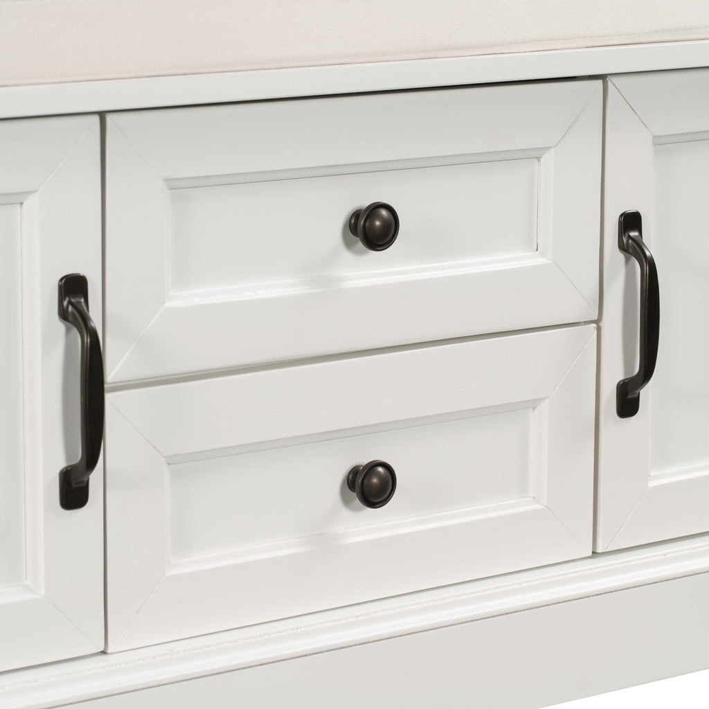 The storage bench with cushion brings a decorative and functional storage piece to your Entryway, foyer, mudroom or laundry room. The distressed aluminum drawer handles can add an extra retro touch to your home. Enclosed doors and drawers meet the needs of the home's multi-purpose storage, making it ideal for storing small items such as books, shoes, umbrella and keeping the living room, hallways and entrances clean and tidy.