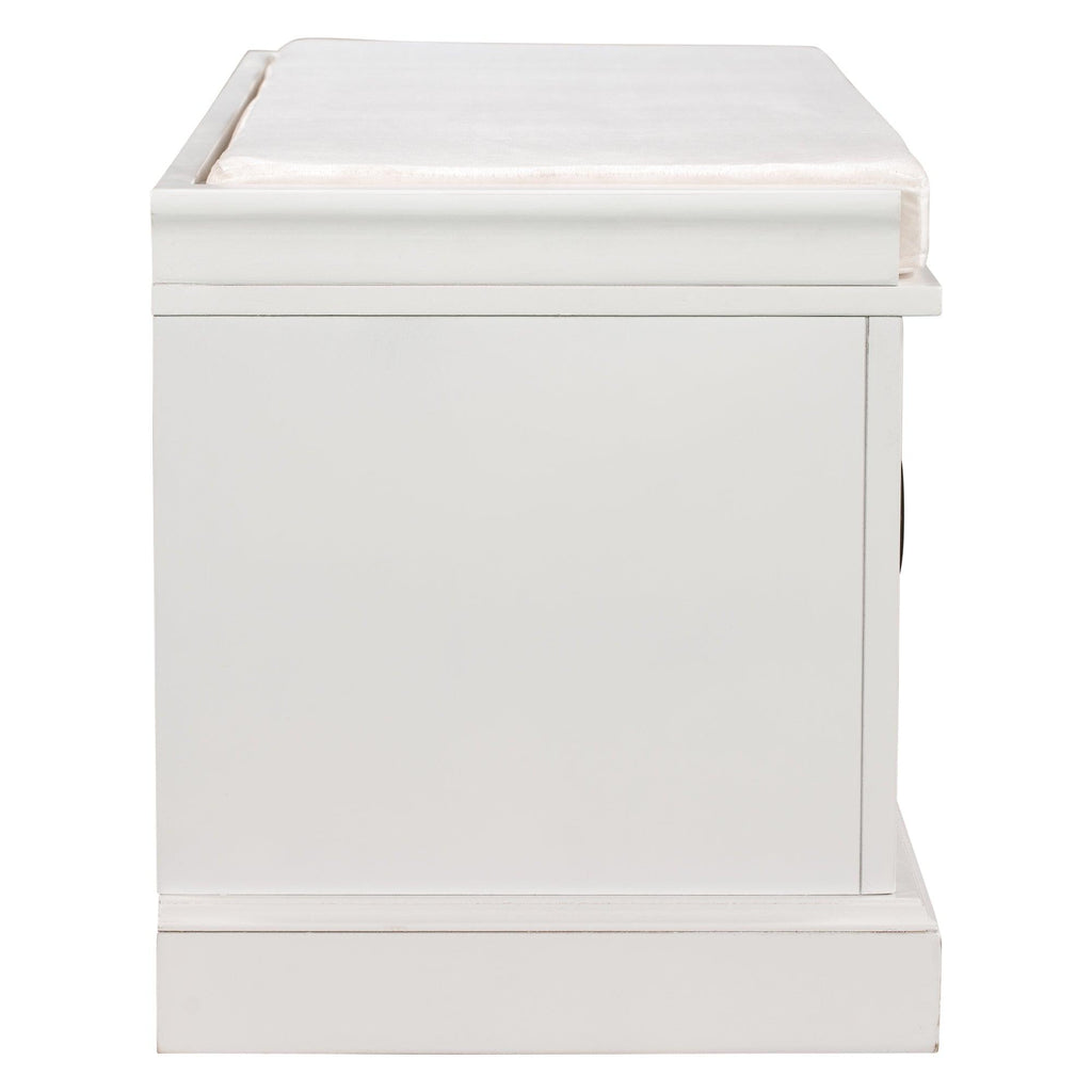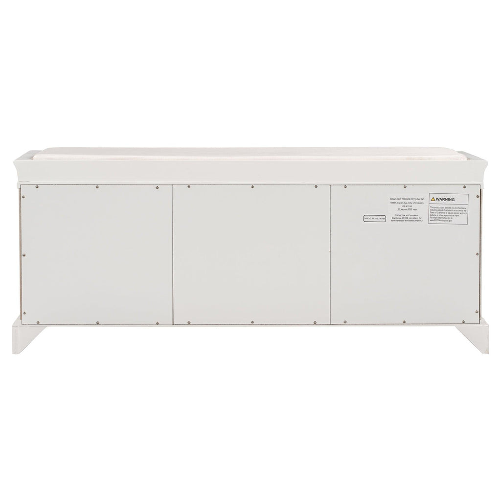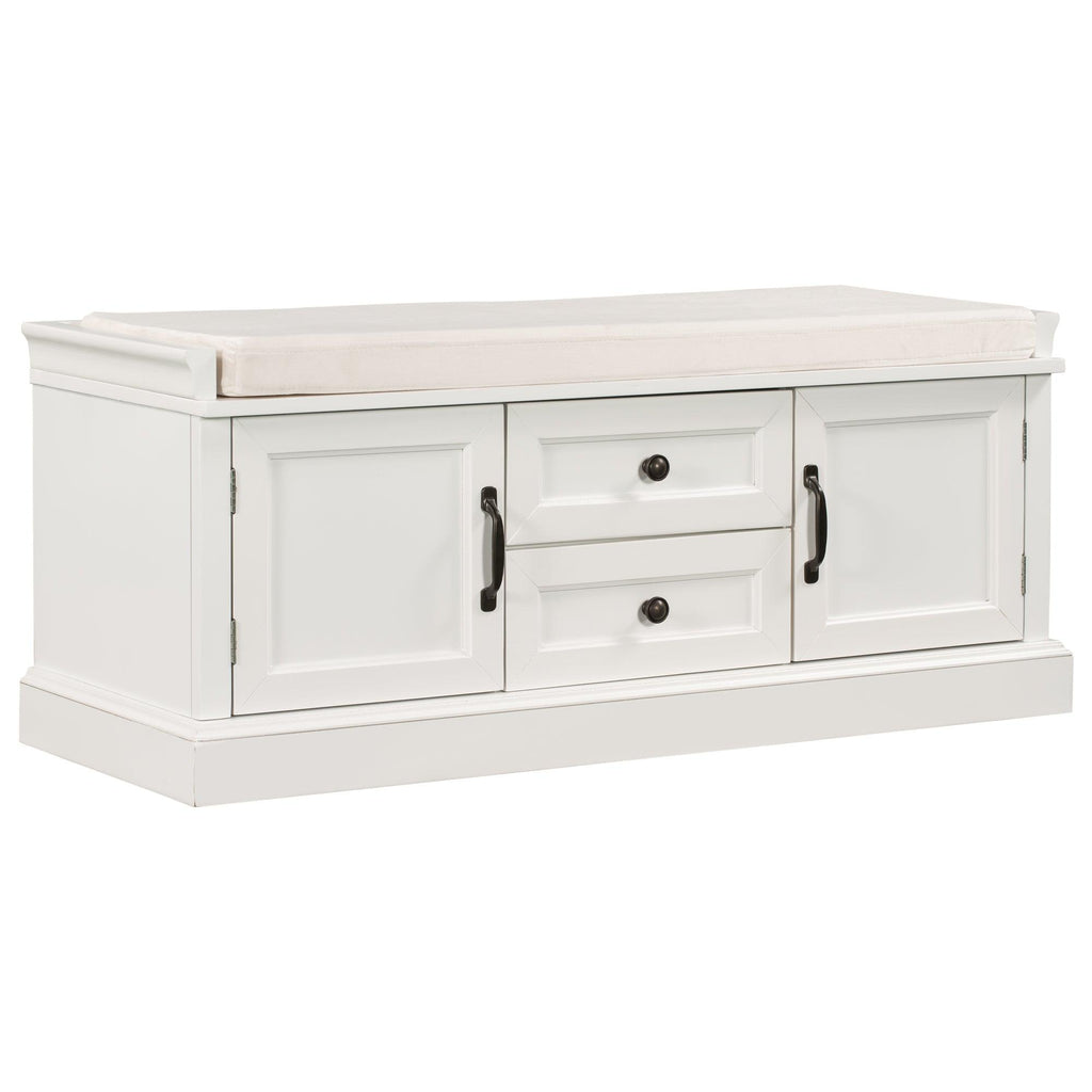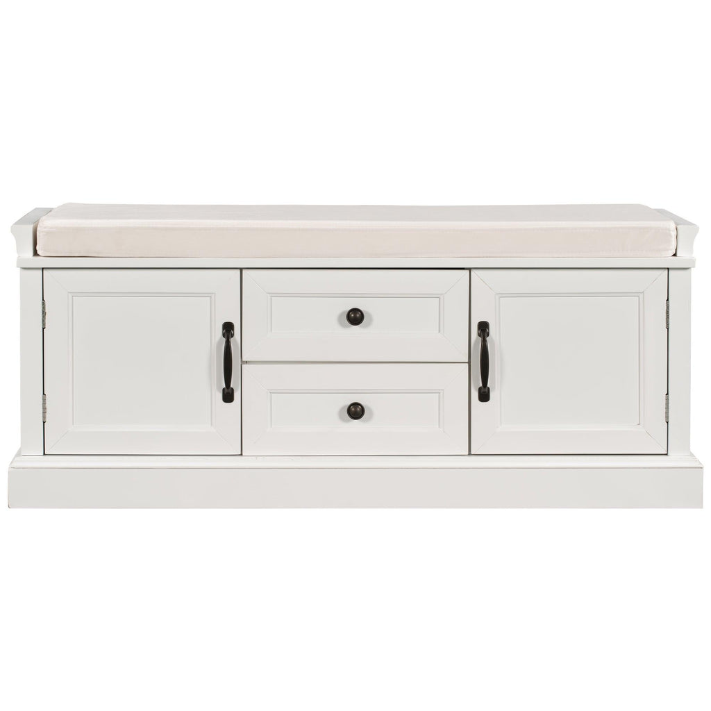 The storage bench with cushion brings a decorative and functional storage piece to your Entryway, foyer, mudroom or laundry room. The distressed aluminum drawer handles can add an extra retro touch to your home. Enclosed doors and drawers meet the needs of the home's multi-purpose storage, making it ideal for storing small items such as books, shoes, umbrella and keeping the living room, hallways and entrances clean and tidy.