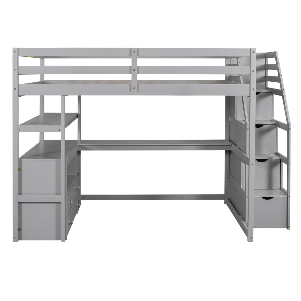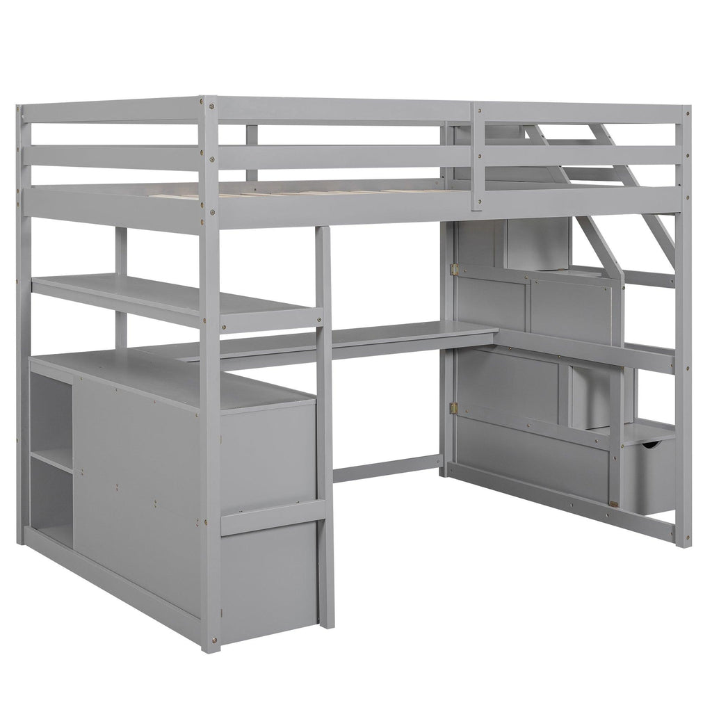 Full Size Loft Bed with Desk and Shelves, Two Built-in Drawers, Storage Staircase, Gray