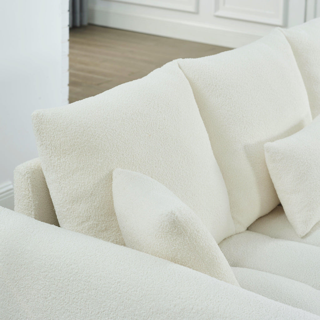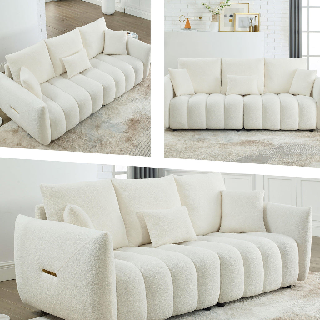 - The modern sofa is made of soft teddy fabric plus foam padding to provide you with maximum comfort. Sitting on it, you will be surrounded by ultra-soft plump backrests with optimal comfort angles, making you feel like you are sitting on a cloud. Add this sofa to make your living room space more sophisticated and elegant.