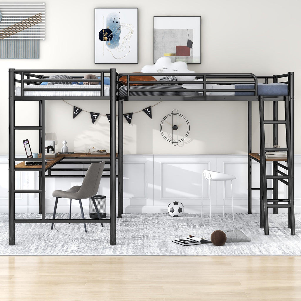 Twin Size Metal Loft Bed with Two Built-in Desks, Black