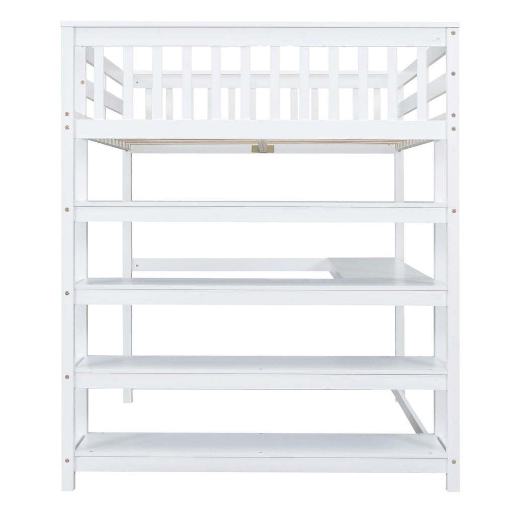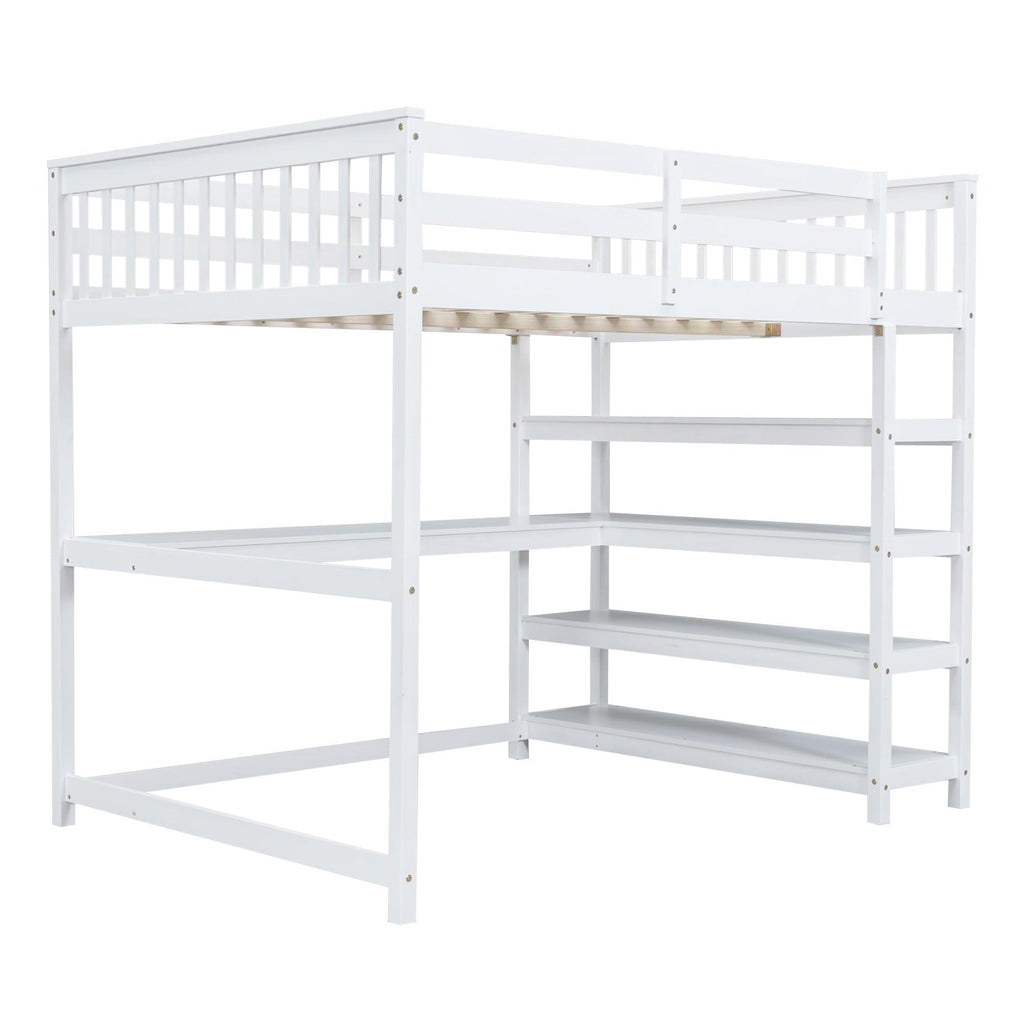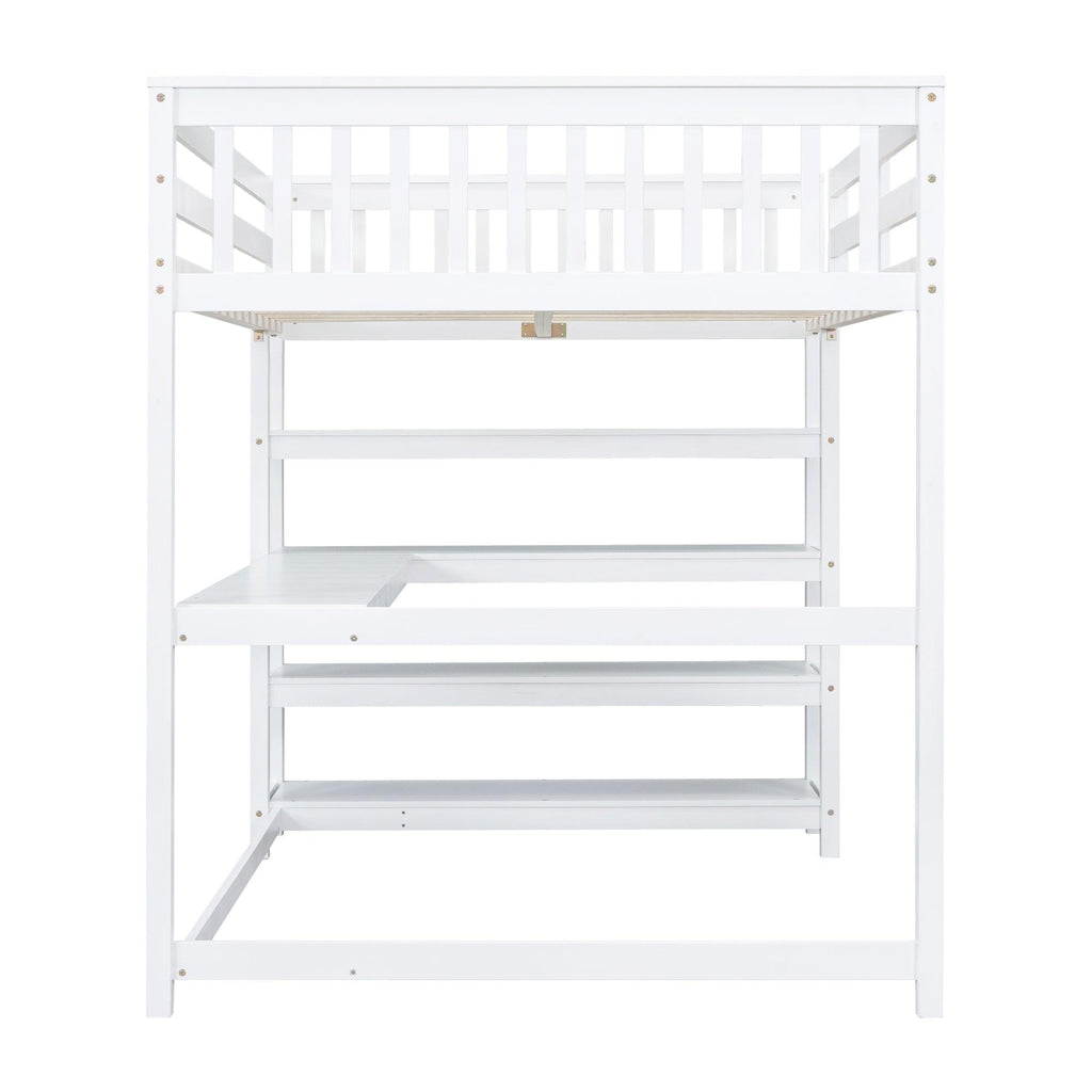 Full Size Loft Bed with Storage Shelves and Under-bed Desk, White