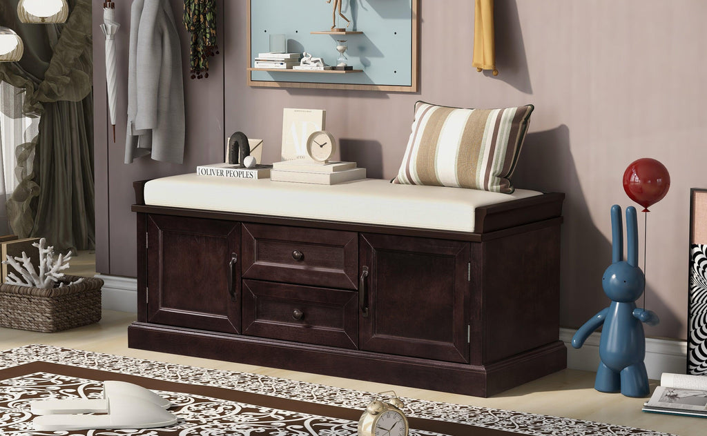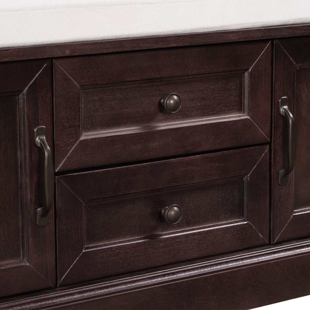 The storage bench with cushion brings a decorative and functional storage piece to your Entryway, foyer, mudroom or laundry room. The distressed aluminum drawer handles can add an extra retro touch to your home. Enclosed doors and drawers meet the needs of the home's multi-purpose storage, making it ideal for storing small items such as books, shoes, umbrella and keeping the living room, hallways and entrances clean and tidy.