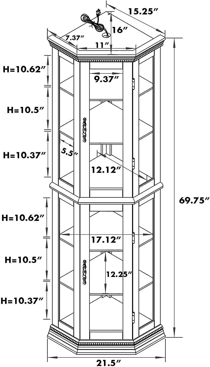 Adjustable Shelves:This lighted corner curio cabinet offers 2 fixed shelves and 4 tempered glass shelves, which is best for valuable or fragile items.The tempered glass shelves can also be removed if you would like to display taller items. Overall Dimensions: 69.75'H x 21.5'W x 16'D, Holds up to 150 lbs. Each of the shelves can hold up to 25 pounds of distributed weight.