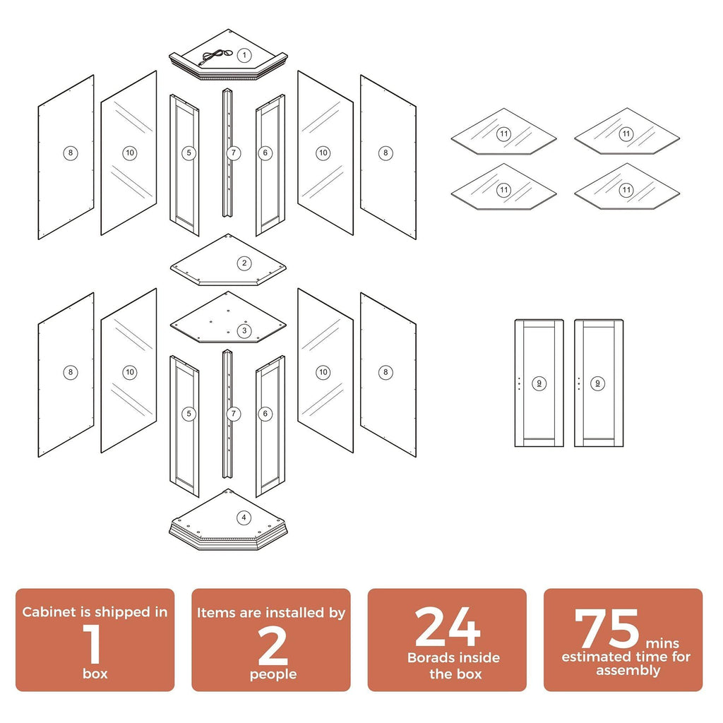 Looking to display your cherished collectables? With curio cabinets, the beauty is in the mix. They are perfect for displaying a range of sentimental items. Bring classic elegance to your room by displaying your favorite items inside the corner curio cabinets,which offers four removable tempered glass shelves to perfectly showcase collections of books, framed photographs, fine china, crystal glassware ect. Corner glass cabinet An elegant corner curio cabinets with glass doors and shelves To hone in on your one-of-a-kind decor style with our wood curio cabinets Of you have a lot of items to display but not a lot of space, Our Lighted Curio Cabinet is a great option because it fits right into a corner. Classic Design Door has an elegant decorative handle. Curio cabinet has a decorative beaded molding that adds style. 2 tempered glass doors allow easy viewing of contents. Tempered glass shelves hold 25 lbs each and won't easily break. Includes anti-dumping belts for maximum stability.