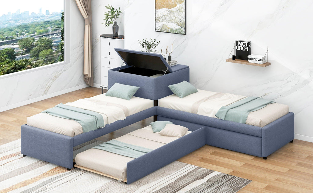 This bed increased sleeping capacity is the perfect solution for cottages, extended family, out-of-town guests, or hosting your rambunctious friends for a sleepover. The unique L-shaped platform bed s offers a space-saving design which can accommodate 3 people. With a trundle and two drawers, especially the built-in square table, this special bed is configured to fit in the corner of the room. Two drawers under the bed are designed to store daily necessities like socks or clothes. Built-in square table in the middle of these two twin beds offers both more durability and functionality which can be used as a nightstand.