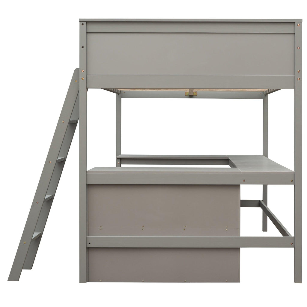 Full size Loft Bed with Shelves and Desk, Wooden Loft Bed with Desk - Gray
