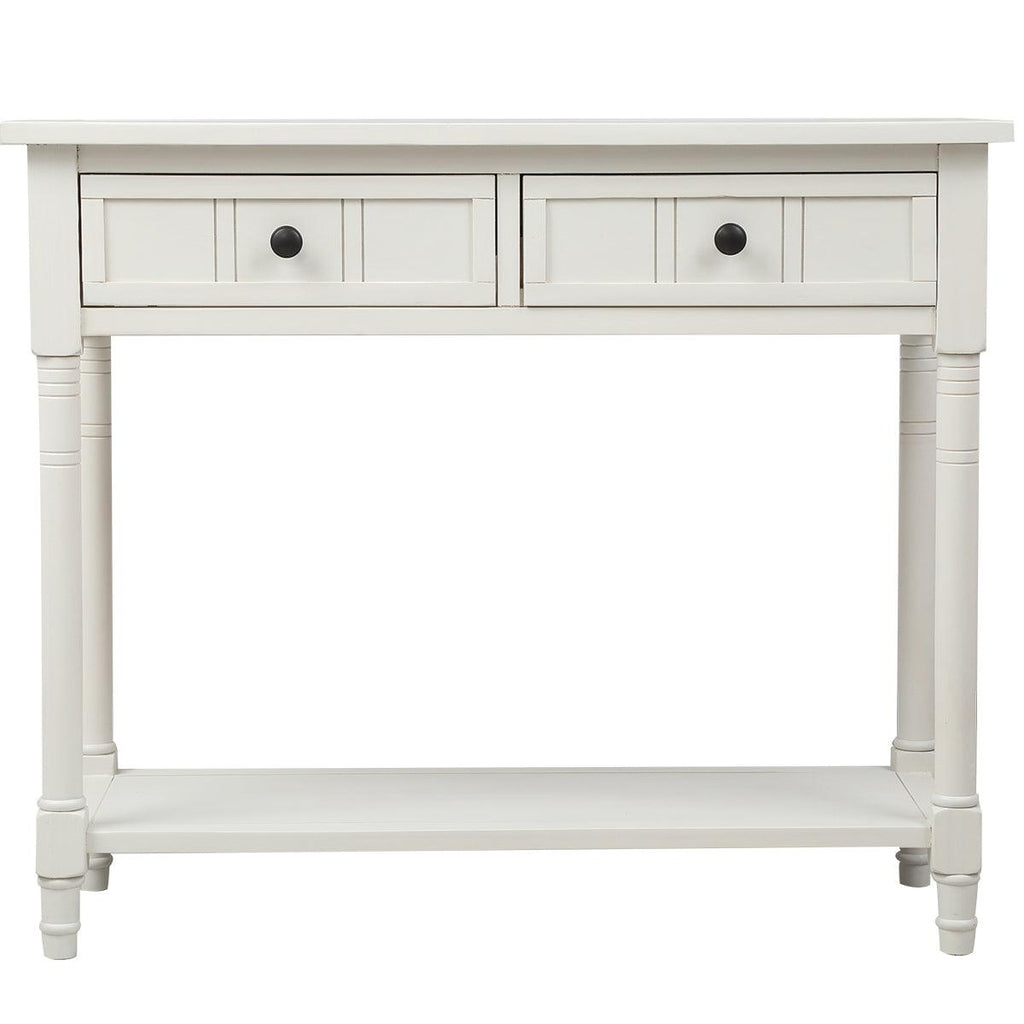 Vintage antique inspired console table finished in a rich deep espresso features versatile timeless design. Two spacious storage drawers allow for concealed organization, thick bottom display shelf tastefully showcases décor