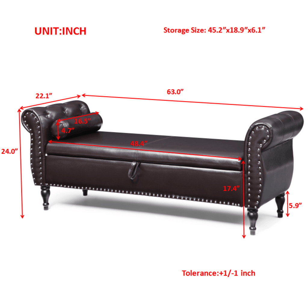 Perfect upholstered flip top storage bench, stylish and functional. With rolled arms, lovely button-tufted, nail head trimmed and soft pressure hinges, this ottoman is an ideal addition to any interior space. Not only provides large storage room but also offers you a comfy bench seat. Ideal accent piece for bedroom/living room/entryway. You can put it in front of your bed to store blanket, pillows or toys. Put it by the window side or fireplace to enjoy the leisure time. Or you can just use it as a footstool. Our storage bench needs minor assembly, just following our instruction. Simply spot clean with a damp cloth. Includes: 1 x chaise lounge 1 x pillow Assembly Instruction