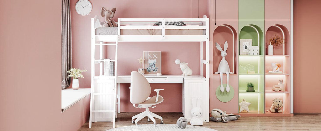 - [Versatility galore] The space underneath the twin size loft bed is a good place for you to read, do homework or play and create their own world to be explored. Coming with drawers, spacious bookshelves, cabinet and desk, the loft bed helps to store books, display decorations, or to place a laptop.