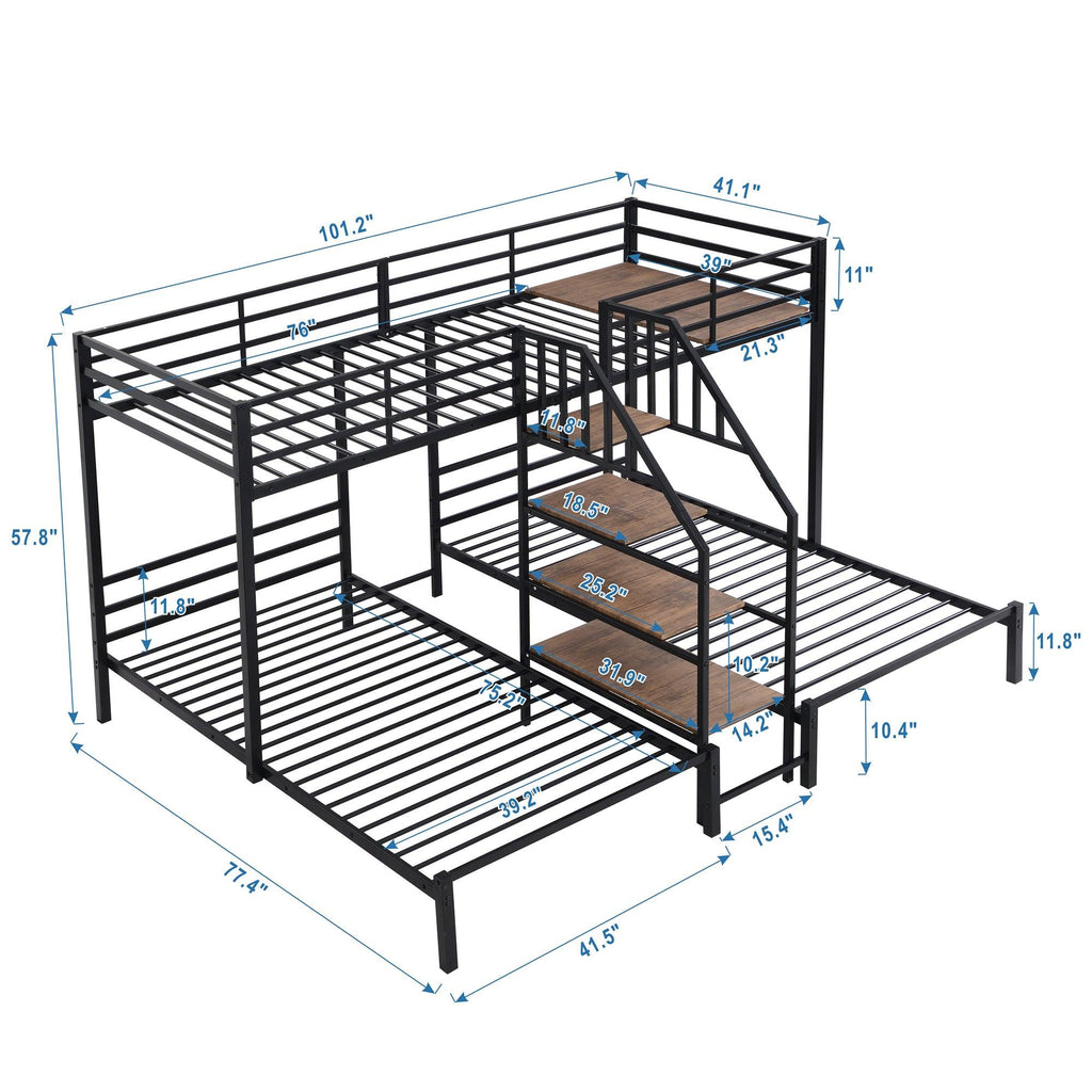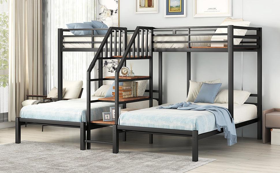 Metal Twin over Twin & Twin Bunk Bed, Triple Bunk Bed with Storage Shelves Staircase, Black