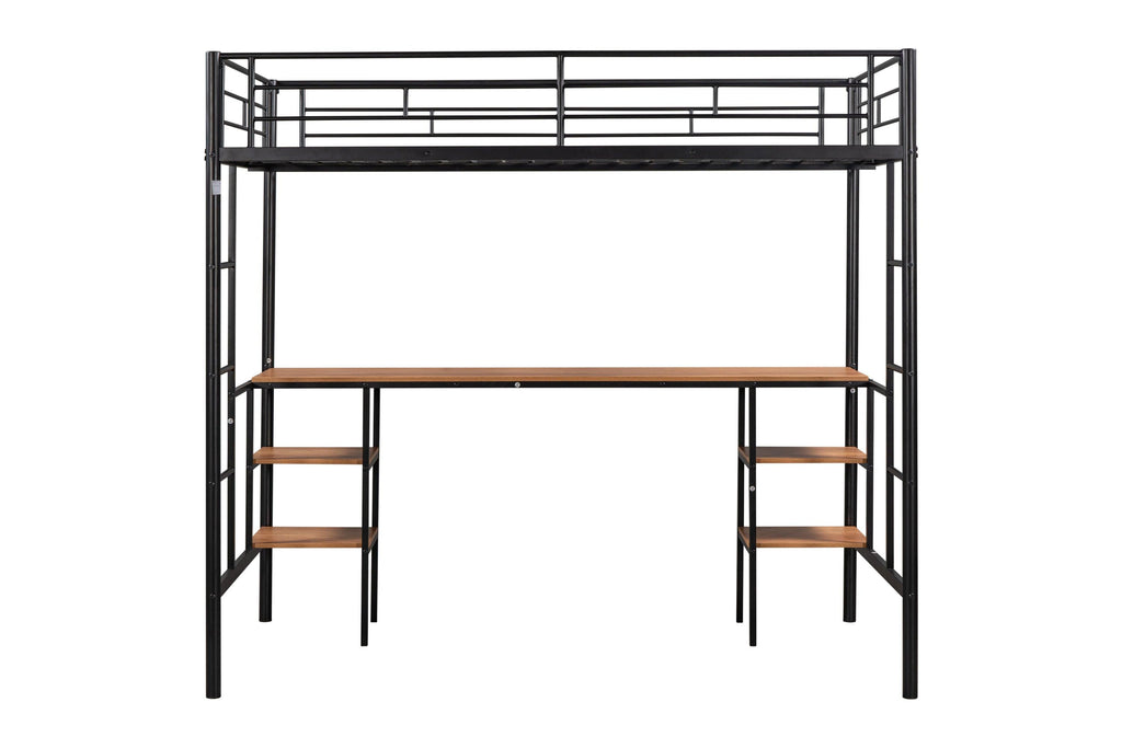 - Space saving: This loft bed with table is designed for rooms with limited floor space. Built-in desk beneath the bed provides a study area or a workstation. Shelves on each side create extra storage space.