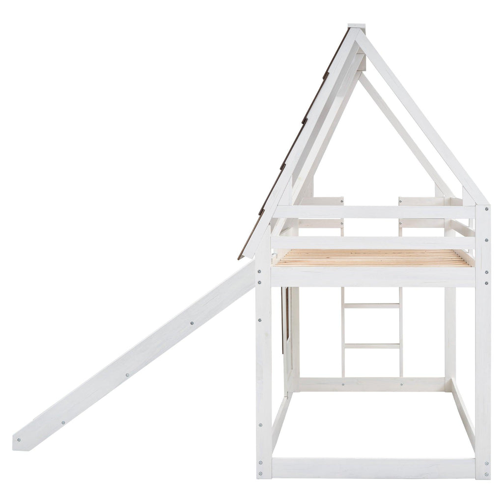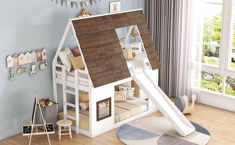 Wood Twin Size House Bunk Bed with Roof, Ladder and Slide, White+Brown