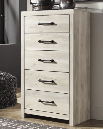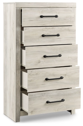 Made of engineered wood (MDF/particleboard) and decorative laminateWispy white finish over replicated oak grain with authentic touchLarge-scale hardware with dark finish5 smooth-gliding drawersDrawer interiors are lined with a faux linen laminate for a clean, finished lookSafety is a top priority, clothing storage units are designed to meet the most current standard for stability, ASTM F 2057 (ASTM International)Drawers extend out to accommodate maximum access to drawer interior while maintaining safetyEstimated Assembly Time: 5 Minutes