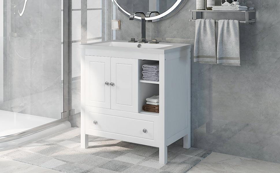 A bathroom vanity is a crucial furniture in every bathroom. With raised groove pattern effect decorations on doors and front boards of drawers, this product meets the needs of daily life and represents high artistic grade. In a humid environment like the bathroom, a furniture needs to take into account the storage requirements of different items. In that case, different functional zones are particularly important. Storage cabinet and drawer offer more options for storing a lot of daily sundries. And these metal round handles ensure the comfort using experience. Users can choose the suitable storage space to place the right items. Wooden structure and MDF boards guarantee the stability and durability in long-term usage. Ceramic basin ensures the smooth touch experience and easy cleaning process, and there are necessary functional holes. This product also shows elegant and rigorous temperament, thus, it's very suitable for your different bathroom decoration style.