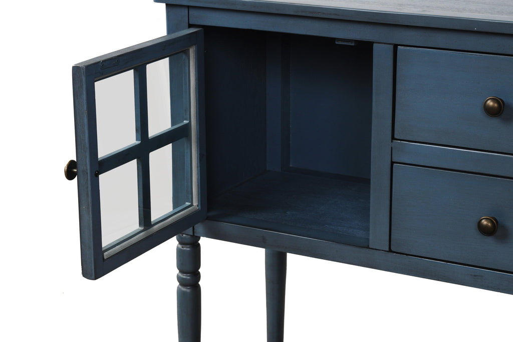 - Featuring spacious open table top and bottom shelf, two glass-front cabinets and two drawers, this sideboard provide you enough storage space for your favorite decorations or books or for storing necessities and tableware.