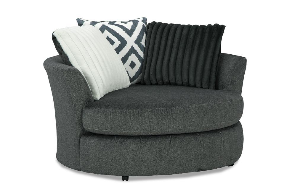 Redefine your living space with the graceful simplicity of the Tweed Gunmetal Collection. Designed with plush, wide track arms and soft chenille-like fabric, this group blends relaxed comfort with high-end polish. The geometric patterns and ribbed textures on the accent pillows and ottoman add visual interest while maintaining a serene, tonal palette.