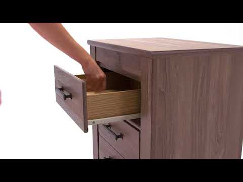 - If effortless elegance is the impression you’re going for, this nightstand is custom made to fit your space. It’s got the crisp, clean lines of a contemporary piece, but with softly weathered elements, including antiqued industrial pulls and an earthy finish that lets the beauty of replicated oak grain flow through. Two smooth-gliding drawers of varied size make it a bedroom essential.